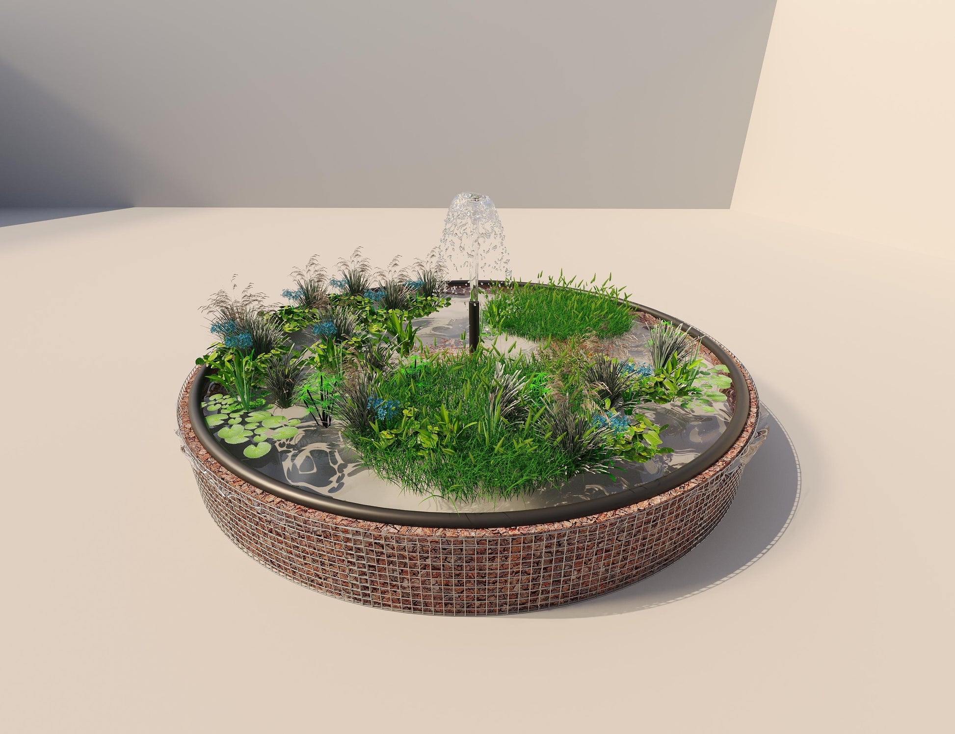 Gabion-højbassin - Elegant rundt design med fleece og bassinforing