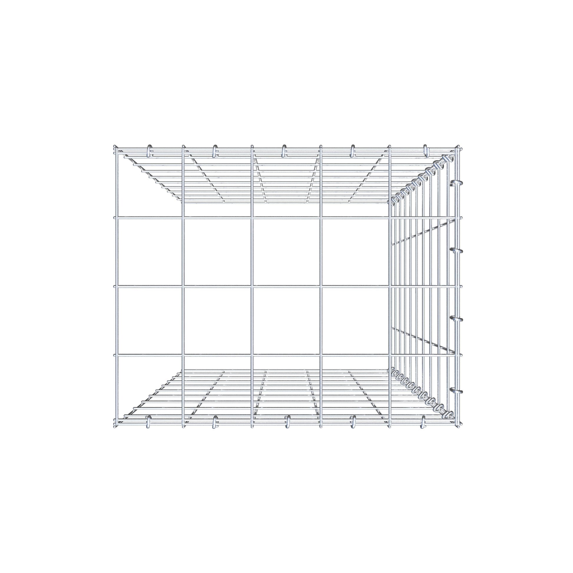 - Hinweis: kein eigenes Bodengitter und kein eigenes Stirngitter – die Verbindung erfolgt über das Deckelgitter und den Verschluss der unteren Gabione sowie den Verschluss der seitlichen Gabione.