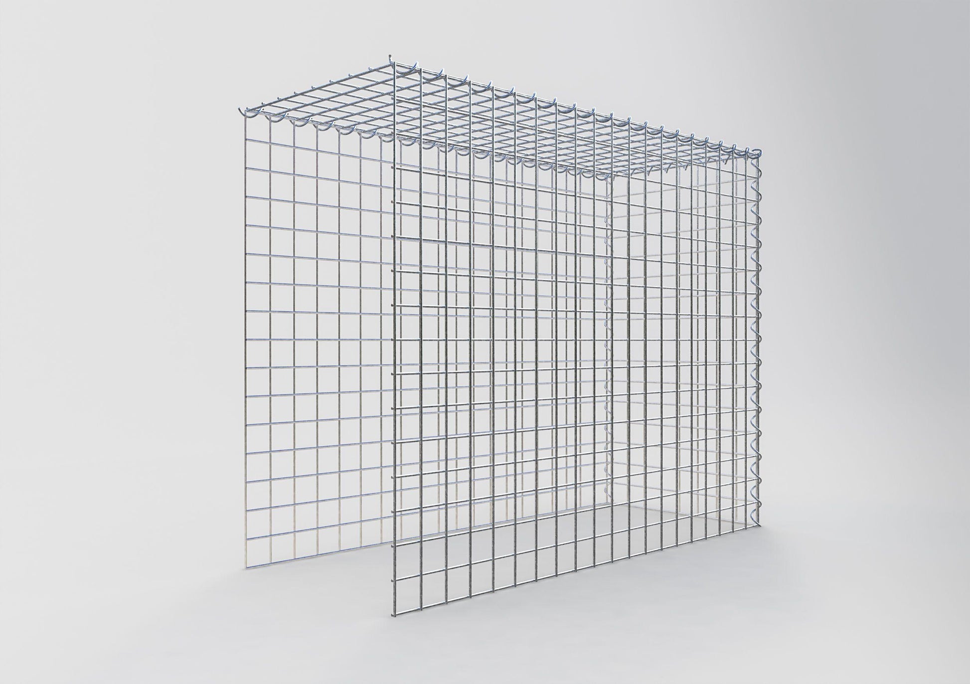 - Remarque : pas de propre grille de fond ni de grille frontale - la liaison se fait par la grille du couvercle et la fermeture du gabion inférieur ainsi que par la fermeture du gabion latéral.