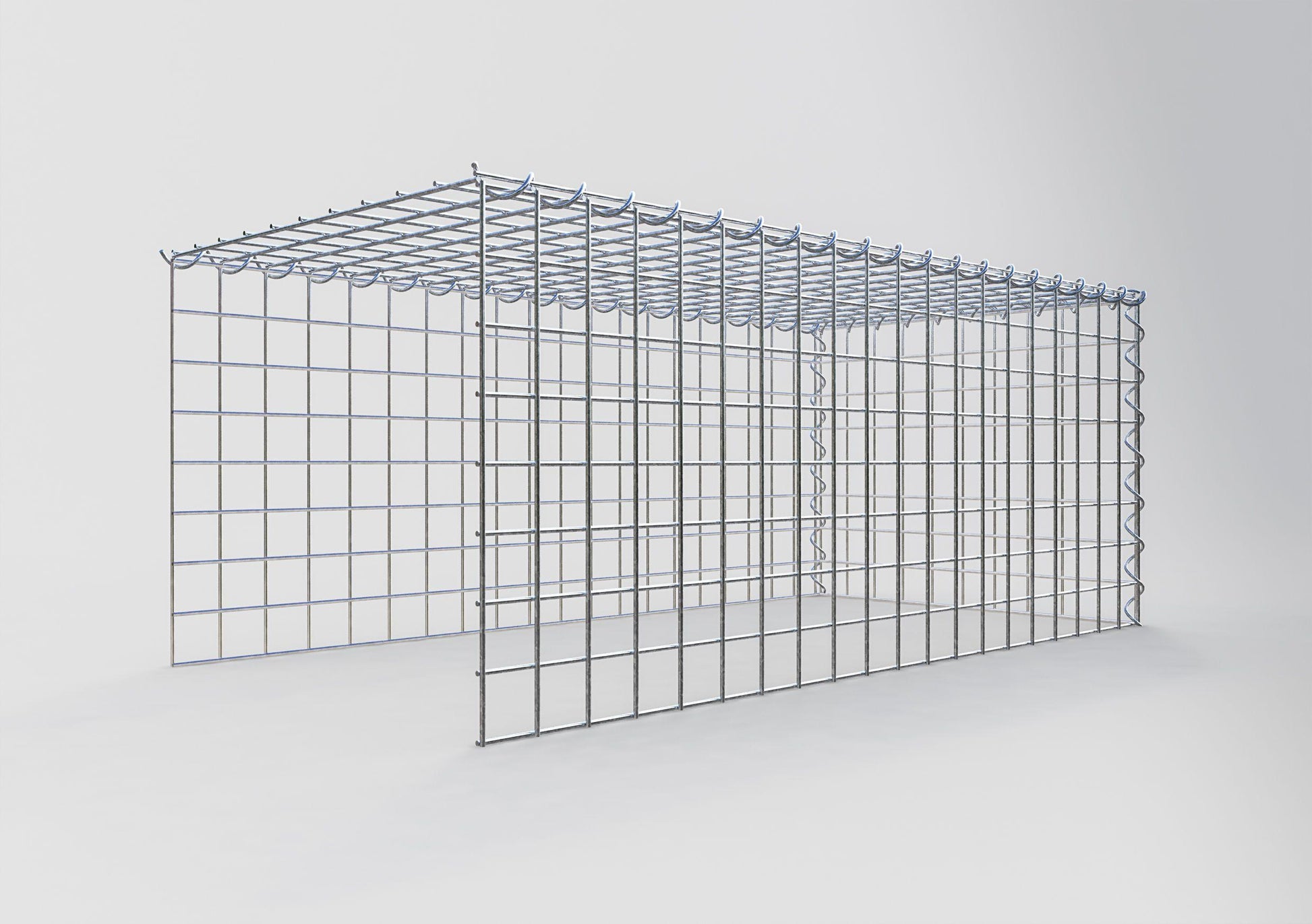 Este gabião não tem grade frontal e inferior. Isso permite que seu gabião cresça tanto em comprimento quanto em altura. Observe que o